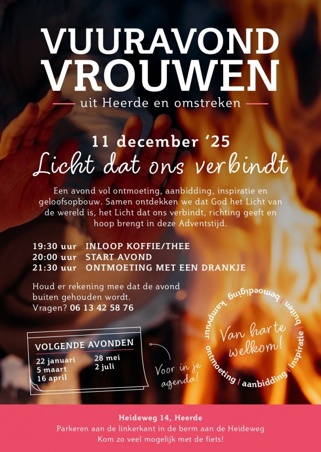 'Licht dat ons verbindt' Een avond vol ontmoeting, aanbidding, inspiratie en geloofsopbouw. Samen ontdekken we dat God het Licht van de wereld is, het Licht dat ons verbindt, richting geeft en hoop brengt in deze Adventstijd.